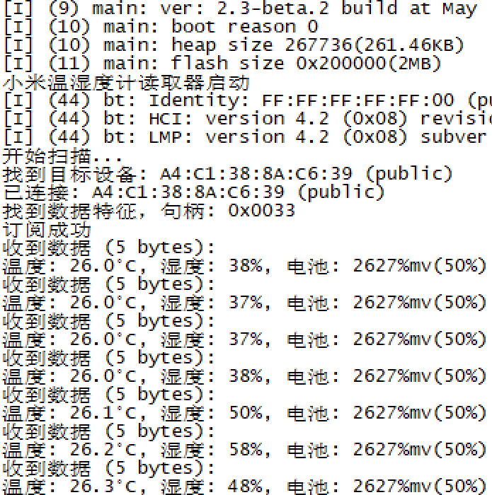 下面对 w800 连接小米温湿度传感器 2 做个示例。主要工作流程为:扫描附近的小米温湿度传感器 2,当其存在之后,连接它,连接之后订阅温湿度服务,然后就等着收到。需要注意,保持连接之后会加速消耗小米温湿度传感器 2 的电池电量,所以尽量定期连接一次,拿到温湿度之后断开它。