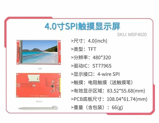屏幕我是用4.0寸的st7796s,分辨率480*320,最高好像可以支持到80MHZ时钟,还带有触摸和sd卡座:
