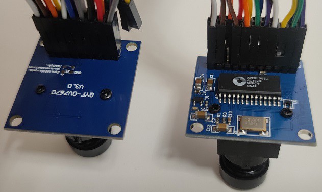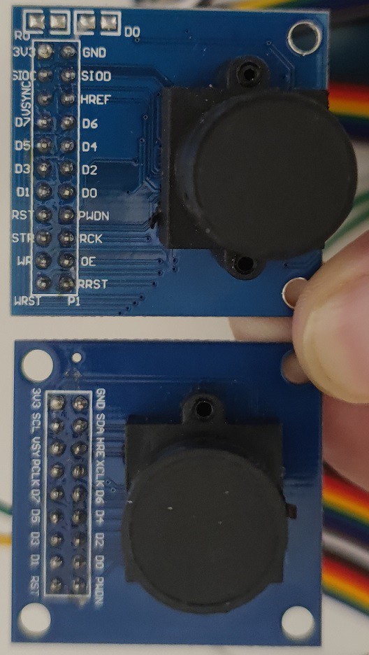 在找资料的过程中,我发现原来ov7670有两款类型的模块,一种就是便宜的几块钱的,另一种是比较贵的。贵的这种是多了一个fifo,目的就是为了降低mcu采集图像难度,这样看来有fifo版本才是初学摄像头玩家的良配,于是我就又购买了一块有fifo的ov7670模块。等拿到手一看,发现这两块都是骑飞电子出的,网上好像还有正点原子版本的、普中的等等,这些的引脚都不大相同,调试时还是得区分清楚。