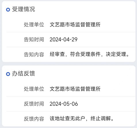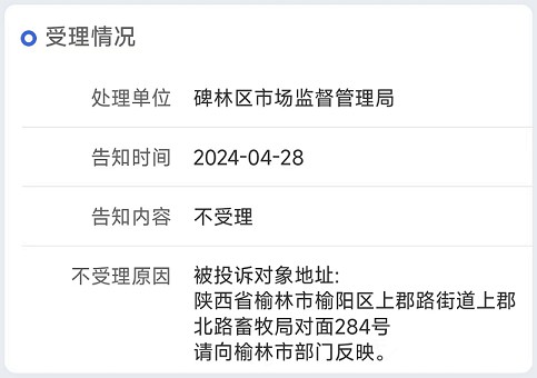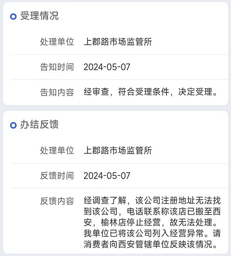 发现商家是榆林市的一家公司,于是就填单子到了榆林市的市场监管部门,反馈很快,隔天就完结答复说这家公司已经搬到西安了,让我找西安部门投诉。