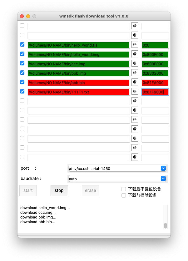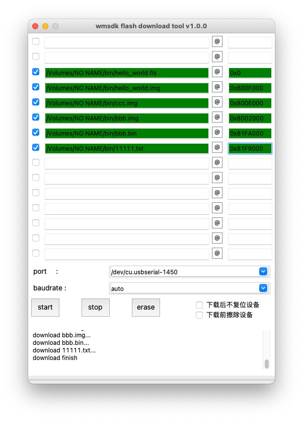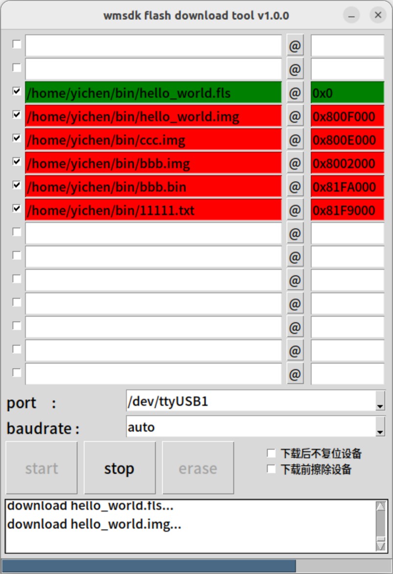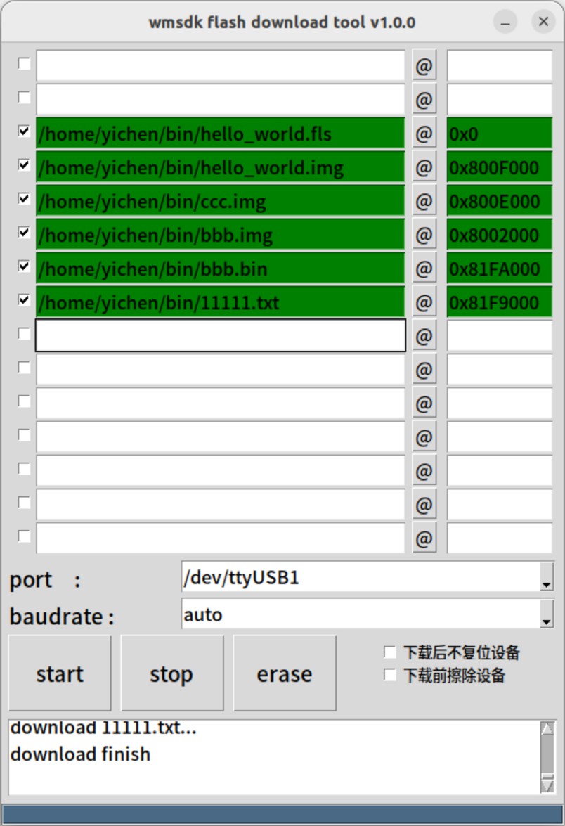 · 可以烧写任意文件到指定的 flash 位置处(先选文件,再填好地址即可)